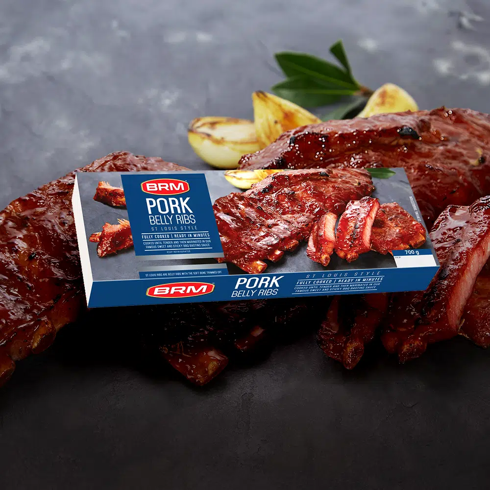 Cooked Pork Belly Ribs (70%) [Contains: Pork, Water, Salt, Phosphates, Herbs and Spices, Acidity Regulator, Colourant, Curing Agents: Sodium Nitrate and Sodium Nitrite]